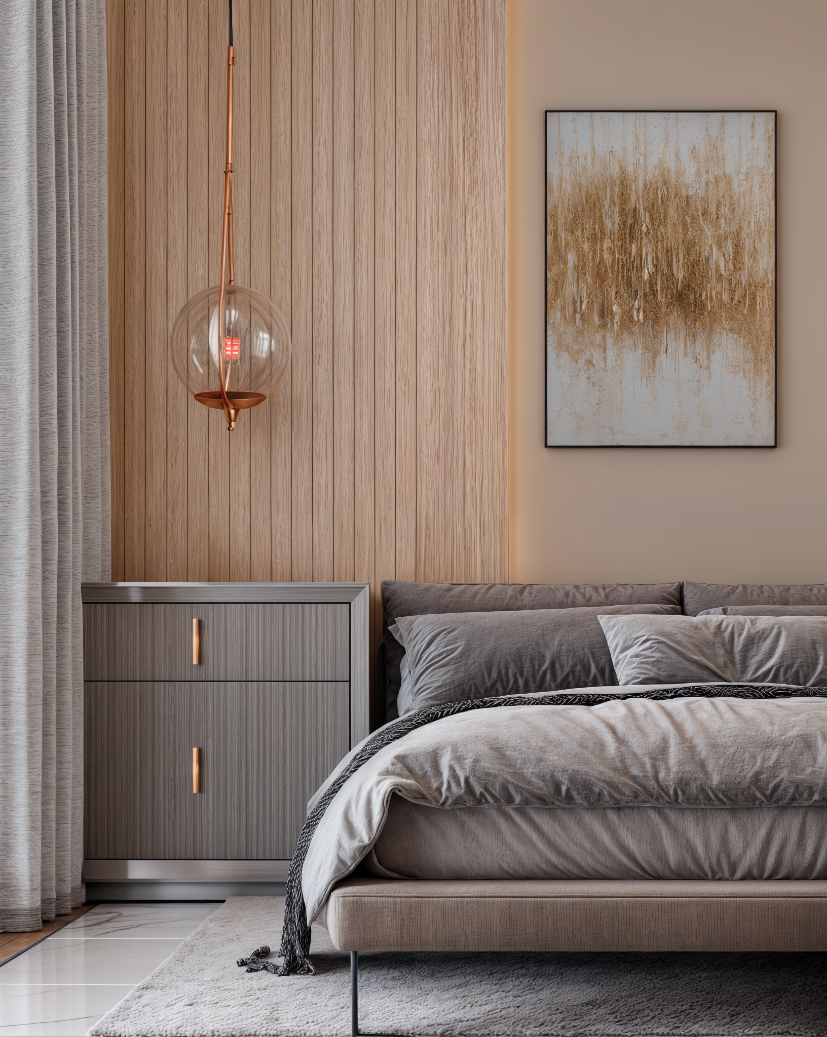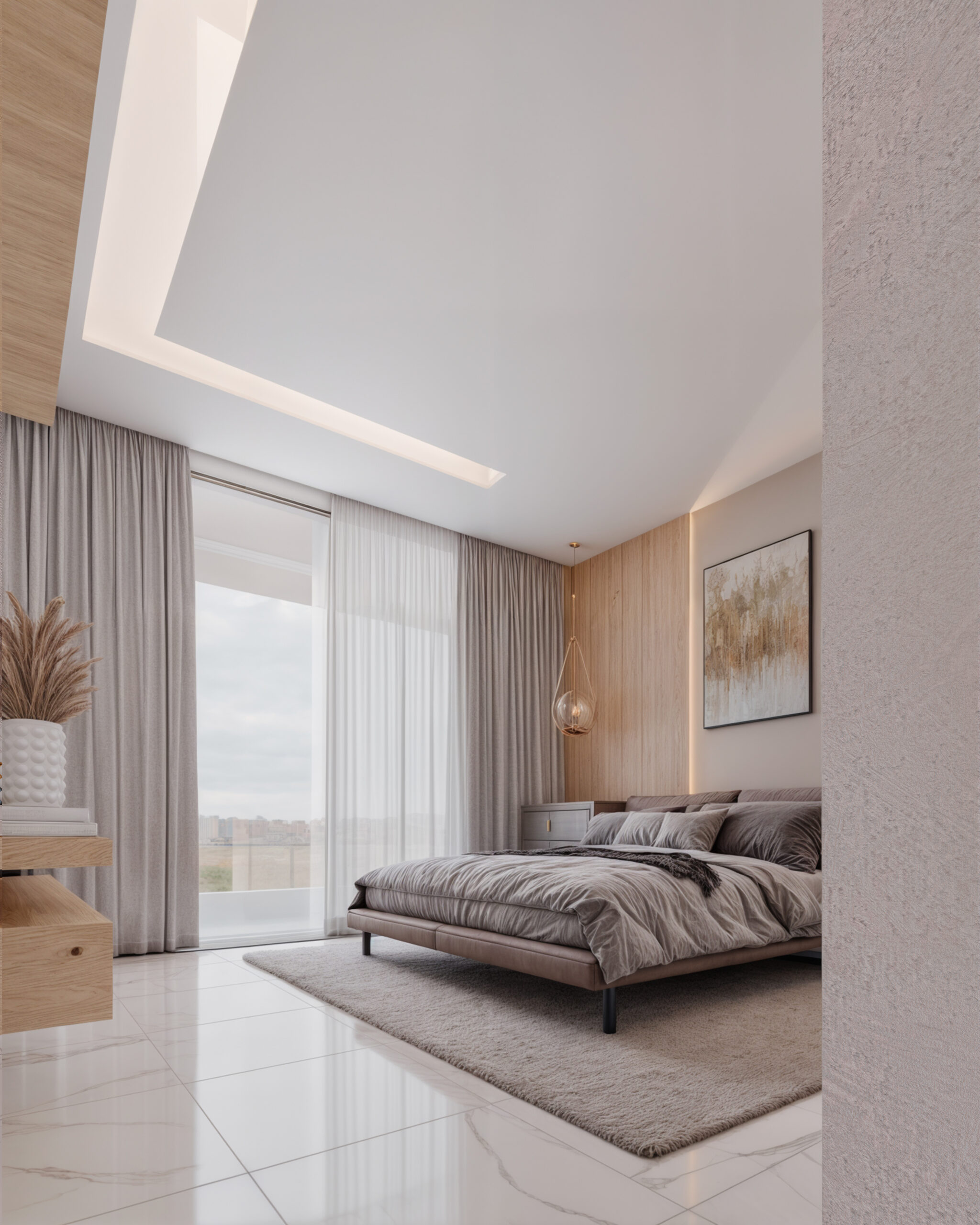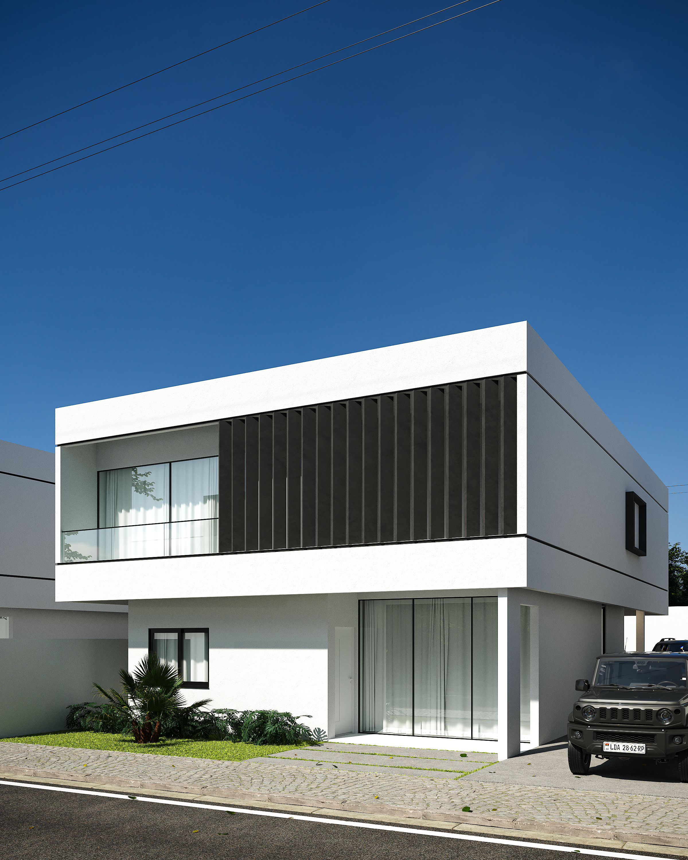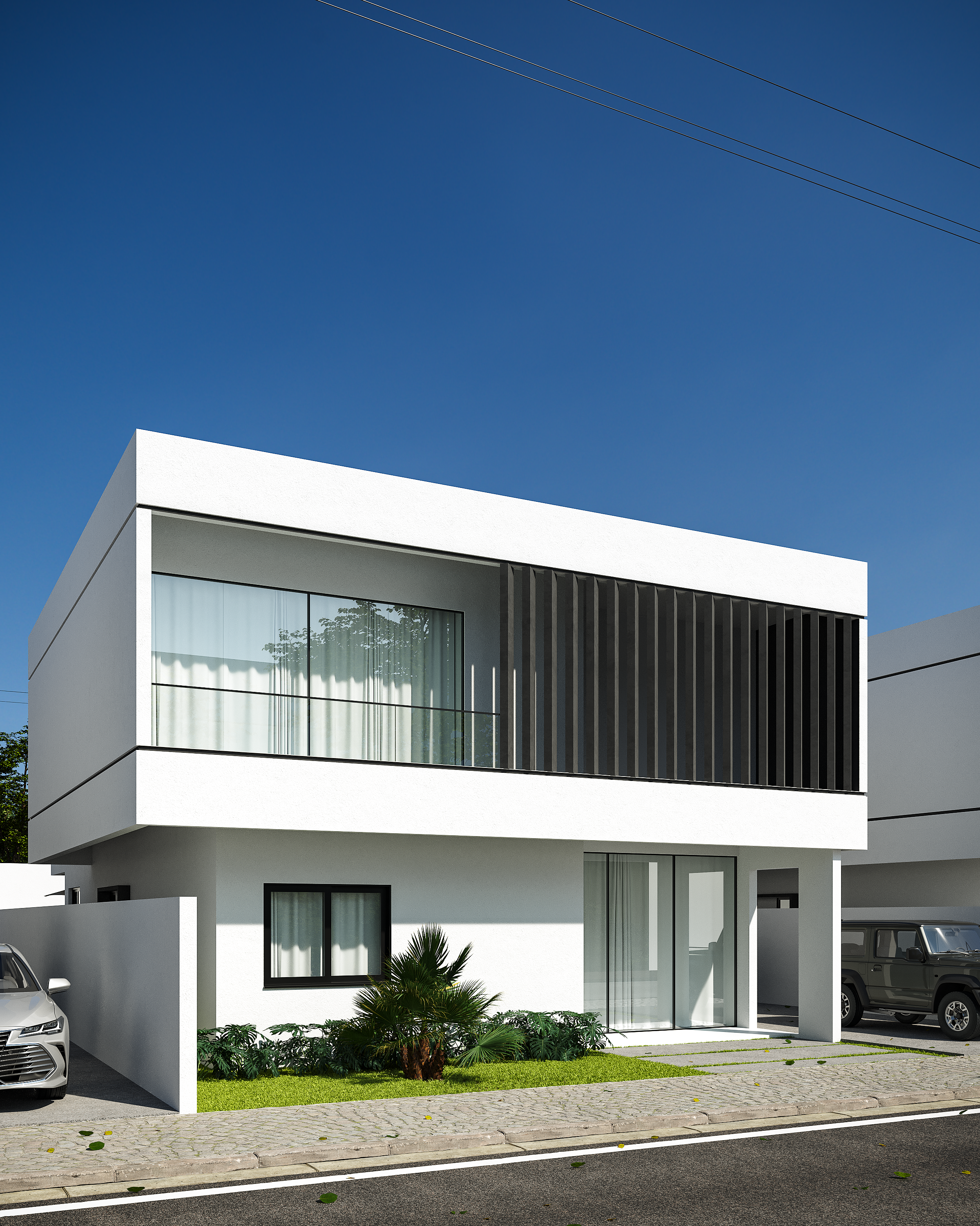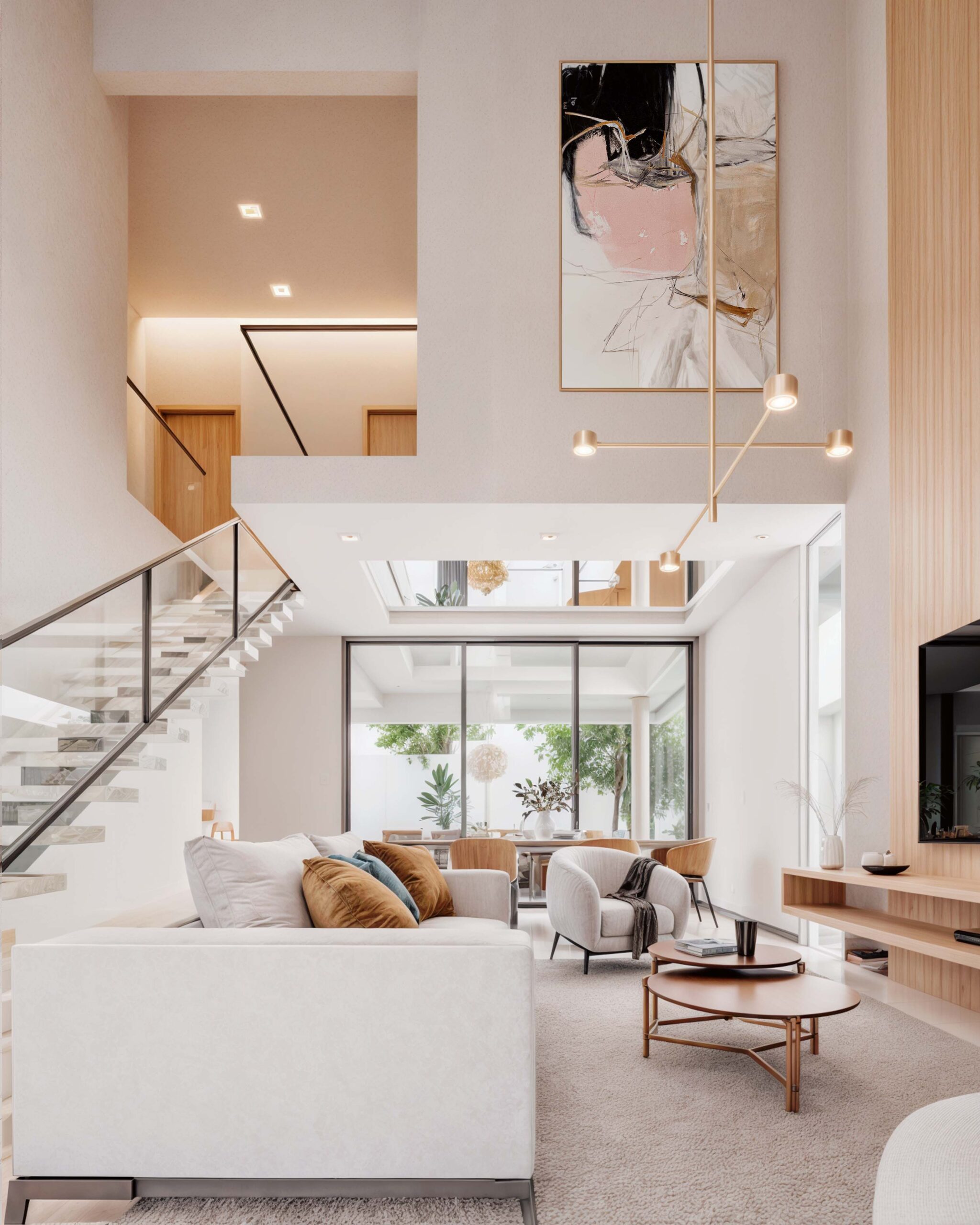 No rés-do-chão, a zona social é o coração da casa, integrando sala de estar, jantar e área gourmet com ligação direta ao pátio. No piso superior, encontram-se as suítes e áreas de serviço, garantindo maior privacidade e conforto. A iluminação natural e a ventilação cruzada foram trabalhadas de forma estratégica, tornando os ambientes mais agradáveis e sustentáveis.